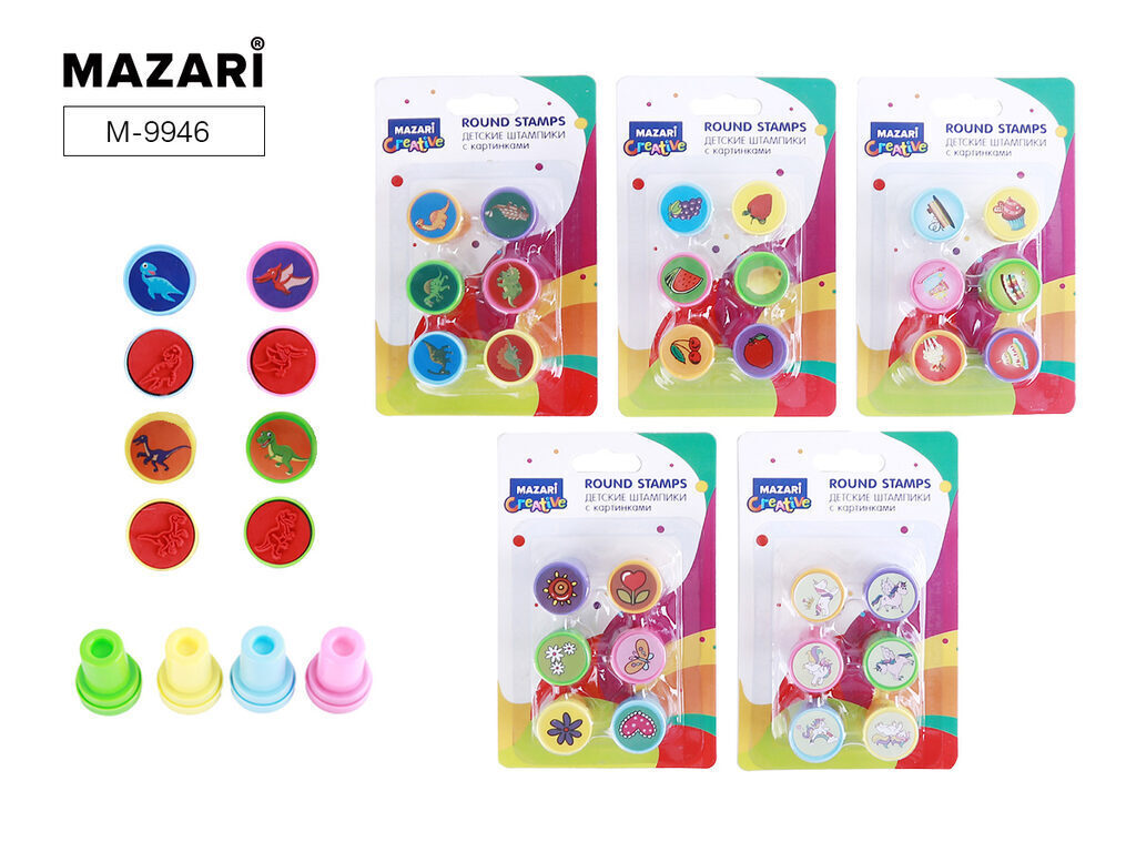 Штампик детский с картинками, размер 2,2х3 см, набор 6 шт, ассорти 2 набора, картинка штампа совпадает с картинкой на крышке, блистерная упаковка