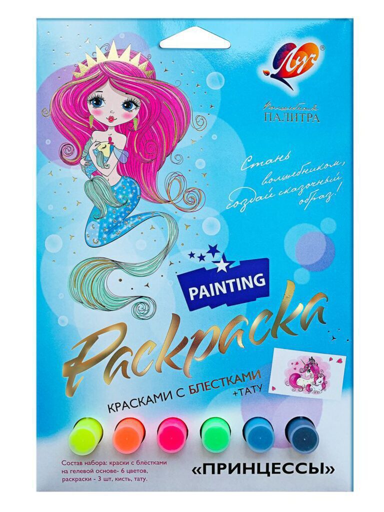 Набор красок с блестками с раскрасками "Принцессы"+ тату