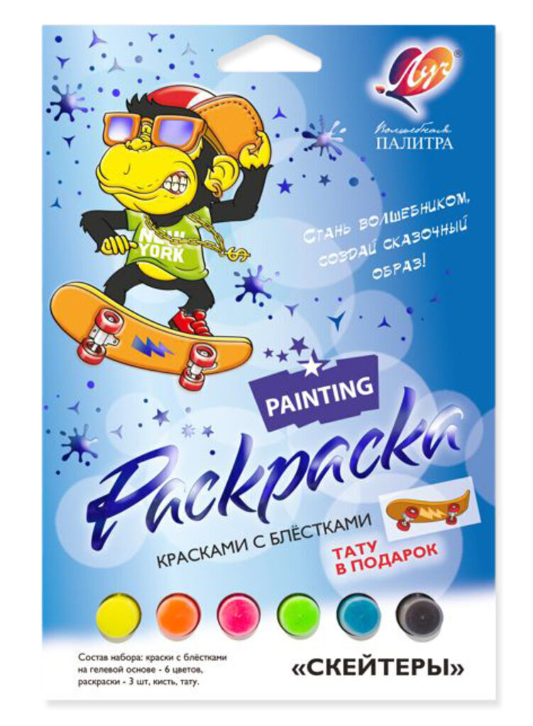 Набор красок с блестками с раскрасками "Скейтеры"+ тату