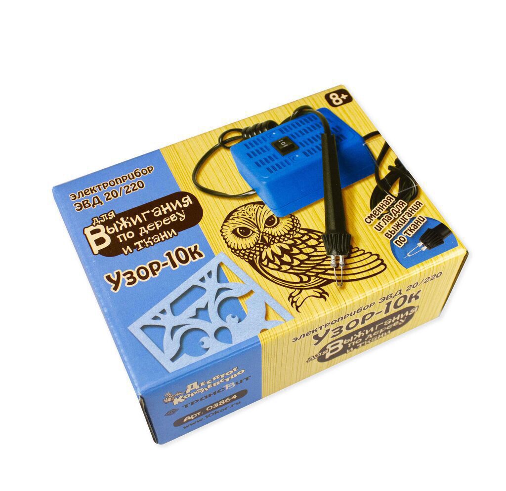 Освойте один из самых интересных и кропотливых видов декоративного искусства выжигание по дереву и ткани с электроприбором Узор 10К от Десятого королевства! Состав: электроприбор для выжигания по дереву (9,5 х 5,3 см, вес 0,66 кг) дополнительная игла для выжигания по ткани руководство по эксплуатации Техническая информация о приборе: напряжение питания прибора 220,50 Гц потребляемая мощность 20 Вт Особенность набора Узор 10К в том, что с его помощью можно освоить сразу 2 хобби пирографию (выжигание по дереву) и гильоширование (выжигание по ткани). Обратите внимание! Работать с тканью рекомендуется на подставке из стекла или искусственного камня в качестве подставки не допустимо использовать пластиковые поверхности. Кликните на оранжевую иконку правил справа или перейдите в раздел Поддержка, чтобы ознакомиться с полным руководством к прибору. Подарите ребёнку возможность освоить мастерство выжигания, обрести новое хобби и разнообразить досуг: украшайте шкатулки, раз