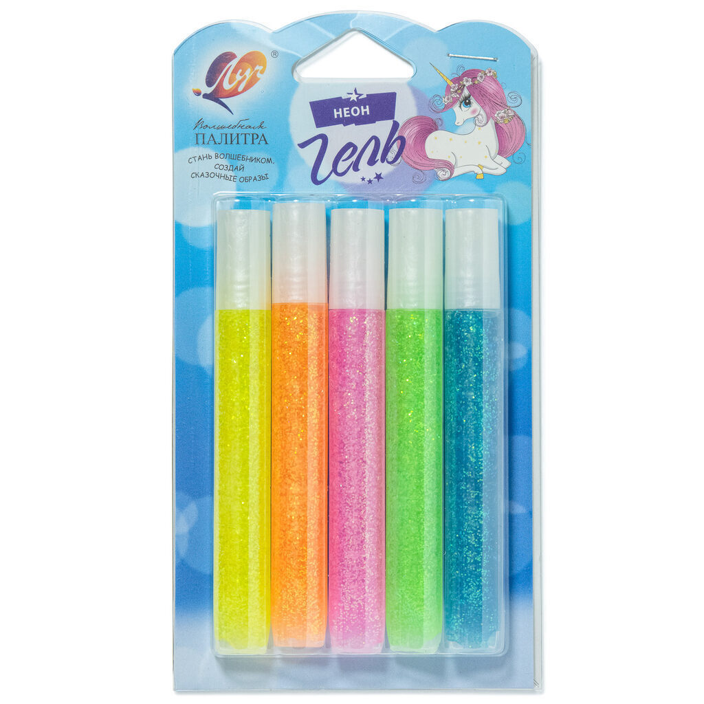 Гель цветной с блестками 5цв*10мл., Неоновый (алый, зеленый, желтый, розовый, голубой)