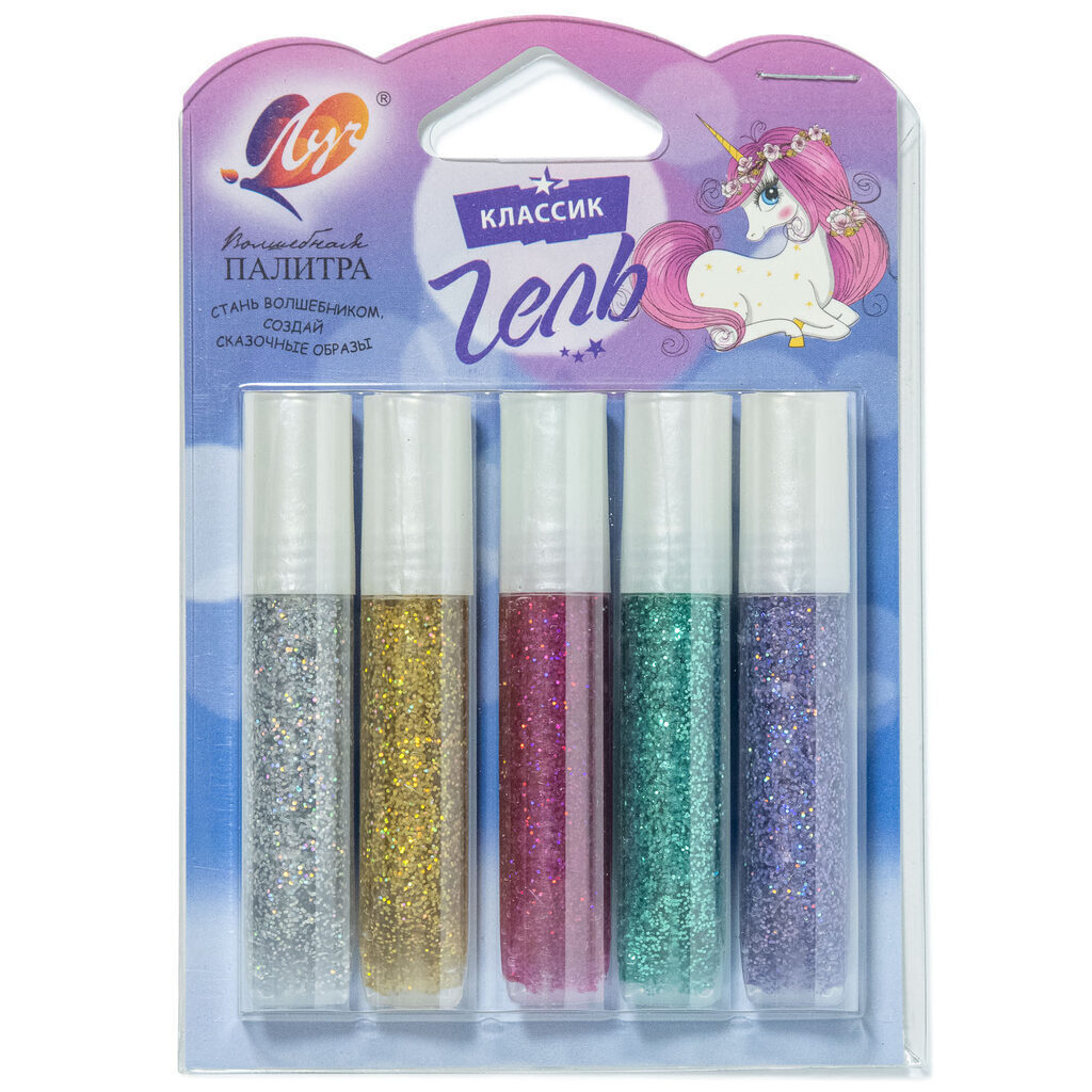 Гель цветной с блестками 5цв*5мл., Блеск (синий, красный, зеленый, серебро, золото)