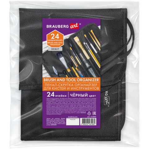 Пенал-скрутка органайзер для кистей и инструментов, 24 ячейки, черный, BRAUBERG ART DEBUT, 272993