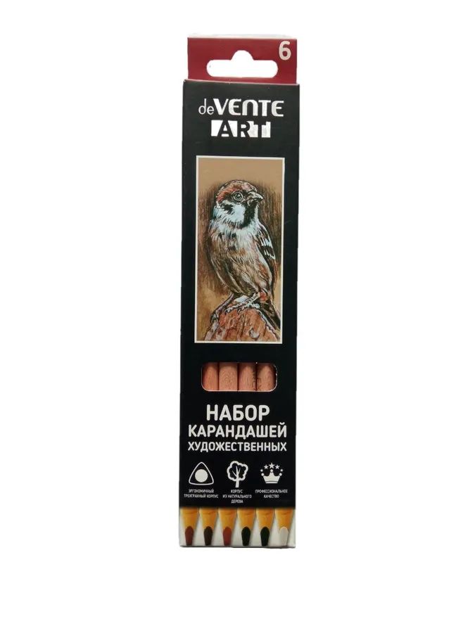 Карандаши художественные "deVENTE. Art" 06 штук (уголь мягкий, уголь супер мягкий, сепия светлая, сепия темная, сангина, белый художественный карандаш), трехгранные, в корпусе из